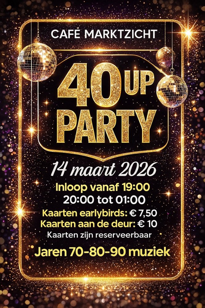 40up Party bij Marktzicht zaterdag, 14 maart 20:00 Café-zaal Marktzicht Etten-Leur De beste muziek van de jaren '70 - '80 en '90 Lees verder Een feest van herkenning voor 40+!De beste muziek van de jaren '70 - '80 en '90Let's dance again !14 maart 2026Om 19.00 uur zaal Marktzicht openOm 20.00 uur - 01.00 uur 40up partyVoorverkoop kaarten € 7,50Binnenkort verkrijgbaar aan de bar.Kaarten aan de deur € 10,00VOL=VOLLaat de gouden tijden herleven met een touch of Glitter & Glamour! Markt 50, 4875 CG Etten-Leur