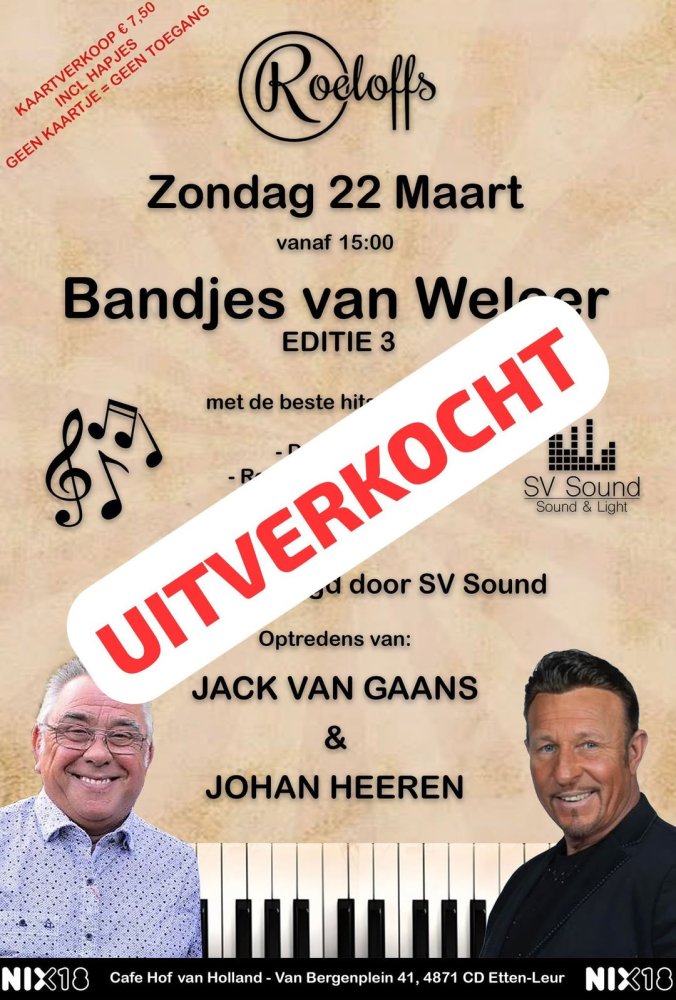 Bandjes van Weleer bij Roeloffs zondag, 22 maart 15:00 Café Hof van Holland - Roeloffs Muziekmiddag. UITVERKOCHT Lees verder Op zondag 22 maart is er een themamiddag bij Zaal Roeloffs: Bandjes van Weleer. Met de beste hits van onder andere De Four Tak, Roland Konings Band, Highway, Pleasure, Jack van Gaans en Johan Heeren.Aanvang 15.00 uur. UITVERKOCHT! Van Bergenplein 41, 4871CD Etten-Leur