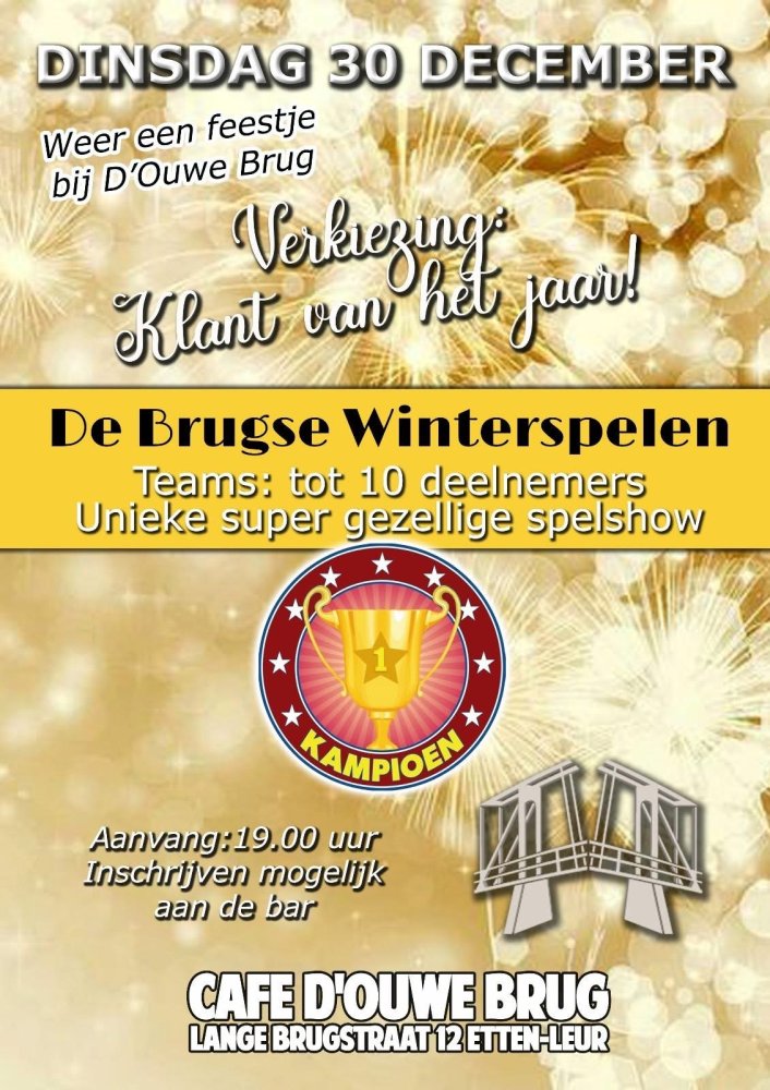 Brugse Winterspelen bij d'Ouwe Brug dinsdag, 30 december 19:00 CafĂ© D'ouwe Brug - Etten-Leur Tevens verkiezing 'Klant van het jaar'. Lees verder Een super gezellige spelshow voor teams tot 10 deelnemers op 30 december bij café d'Ouwe Brug.Tevens verkiezing 'Klant van het jaar'. Vanaf 19.00 uur.Inschrijven aan de bar. Lange Brugstraat 12, 4871 CP Etten-Leur