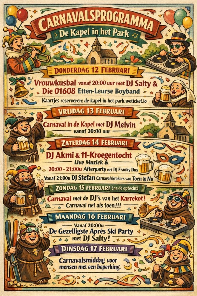 - Donderdag 12 februari: Vrouwkusbal met Die01608 en DJ Salty, vanaf 20.00 uur. Tickets>> - Vrijdag 13 februari: DJ Melvin, vanaf 20.00 uur. - Zaterdag 14 februari: In de middag 11 Kroegentocht met live muziek van Marco de Hollander om 15.30 uur en vanaf 20.00 uur Officiële 11 Kroegentocht Afterparty met DJ Franky Dux (tot 21.00). Vanaf 21.00 uur DJ Stefan met krakers van toen en nu. - Zondag 15 februari: Na de start van de optocht Net als toen met Het Karrekot Trio. - Maandag 16 februari: Vanaf 20.00 Après Ski party met dj Salty. - Dinsdag 17 februari: Carnavalsmiddag voor mensen met een beperking.