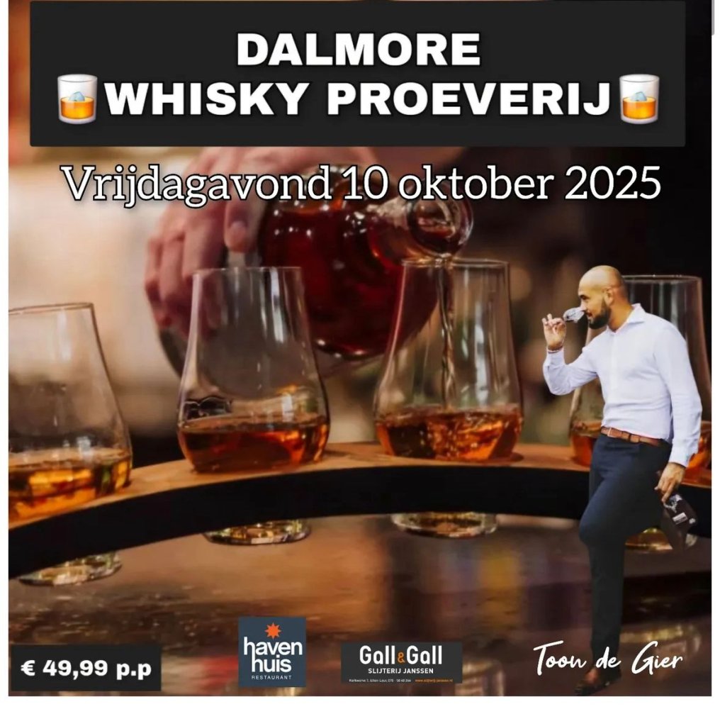 Vrijdagavond 10 oktober 2025 houdt Restaurant het Havenhuis i.s.m. Gall&Gall Janssen een Dalmore whisky proeverij Geserveerd met heerlijke bijpassende gerechtjes.