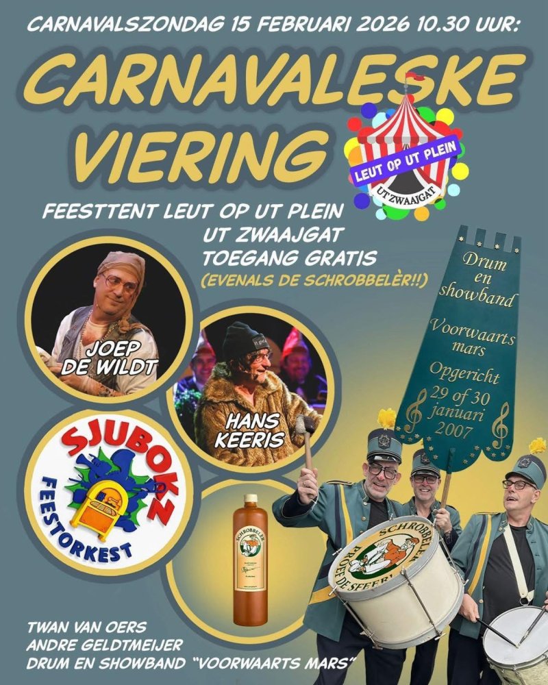 Met de winnaar van het Keiebijters Kletstoernooi Joep de Wildt, en tonprater en tevens mede finalist Hans Keeris belooft het een bijzondere vrolijke en gezellige Carnavaleske Viering te worden . Twan van Oers , Andre Geldtmeijer, Feestorkest Sjubokz en de Drum en Showband " Voorwaart Mars" gaan ook hun steentje bijdragen aan de viering . De viering is geheel gratis en er zijn gratis boterhammen , broodjes en Schrobbelér.