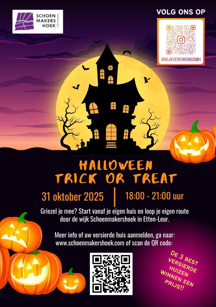 Halloween Trick or Treat in Schoenmakershoek vrijdag, 31 oktober 18:00 Leurse Dijk / Schoenmakerspark Griezel je mee? Lees verder Wijkvereniging Schoenmakershoek houdt op 31 oktober weer een Halloween Trick or Treat.Het is van 18.00 tot 21.00 uur.Griezel je mee? Er is een wandelroute langs diverse huizen in de wijk uitgezet. ,