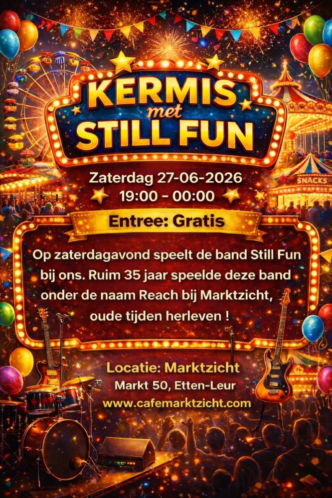 Kermis met Still Fun bij Marktzicht zaterdag, 27 juni 19:00 Café-zaal Marktzicht Etten-Leur Ruim 35 jaar speelde deze band onder de naam Reach bij Marktzicht, dus oude tijden herleven ! Lees verder Kermis met Still FunZaterdag 27-06-2026 | 19:00 - 00:00Entree: GratisOp zaterdagavond speelt de band Still Fun bij ons. Ruim 35 jaar speelde deze band onder de naam Reach bij Marktzicht, dus oude tijden herleven ! Markt 50, 4875 CG Etten-Leur