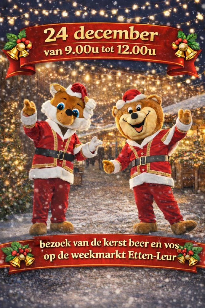 De Weekmarkt op het Raadhuisplein in Etten-Leur belooft op 24 december extra gezellig te worden. De Kerstbeer en kerstvos komen namelijk op bezoek en iedereen mag ze een knuffel geven en met ze op de foto.