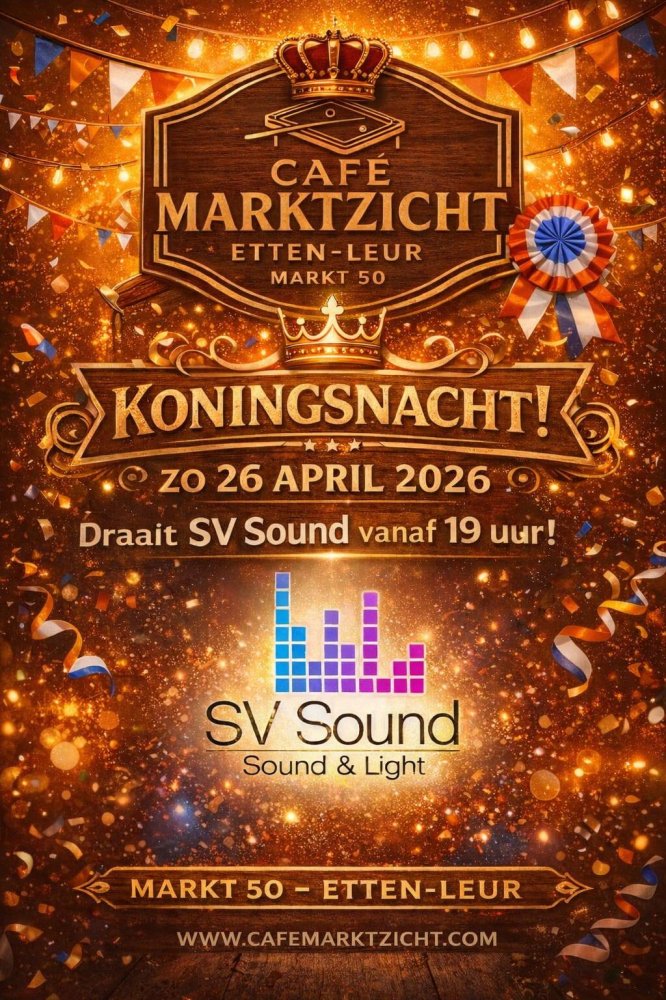 Koningsanacht en Koningsdag bij Marktzicht zondag, 26 april 19:00 Café-zaal Marktzicht Etten-Leur Dag en nacht feest bij Marktzicht Lees verder Koningsnacht, zondag 26 april vanaf 19.00 uur bij Marktzicht muziek van SV Sound.Op Koningsdag draait DJ Djesley vanaf 15.00 uur en is er om 16.30 uur een optreden van Toon Schut. Markt 50, 4875 CG Etten-Leur