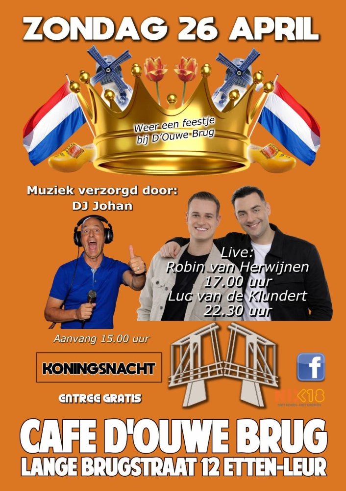 Koningsnacht bij d'Ouwe Brug zondag, 26 april 15:00 Café D'ouwe Brug - Etten-Leur Op zondag 26 april is café d'Ouwe Brug vanaf 15.00 uur geopend voor Koningsnacht. Lees verder Op zondag 26 april is café d'Ouwe Brug vanaf 15.00 uur geopend voor Koningsnacht. DJ Johan verzorgt de muziek.Om 17.00 uur live Robin van Herwijnen.Om 22.30 uur live Luc van de Klundert.Gratis entree. Lange Brugstraat 12, 4871 CP Etten-Leur