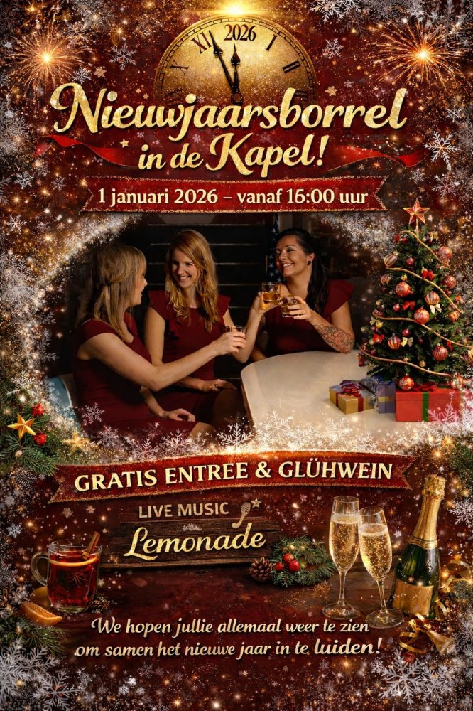 Nieuwjaarsborrel met live muziek in De Kapel donderdag, 1 januari 16:00 De Kapel in het Park Live muziek van LEMONADE. Lees verder De Kapel in het Park houdt op 1 januari een Nieuwjaarsborrel met live muziek van LEMONADE.Vanaf 16.00 uur, entree en een glühwein gratis. Stationsstraat 28a, 4872 TD Etten-Leur