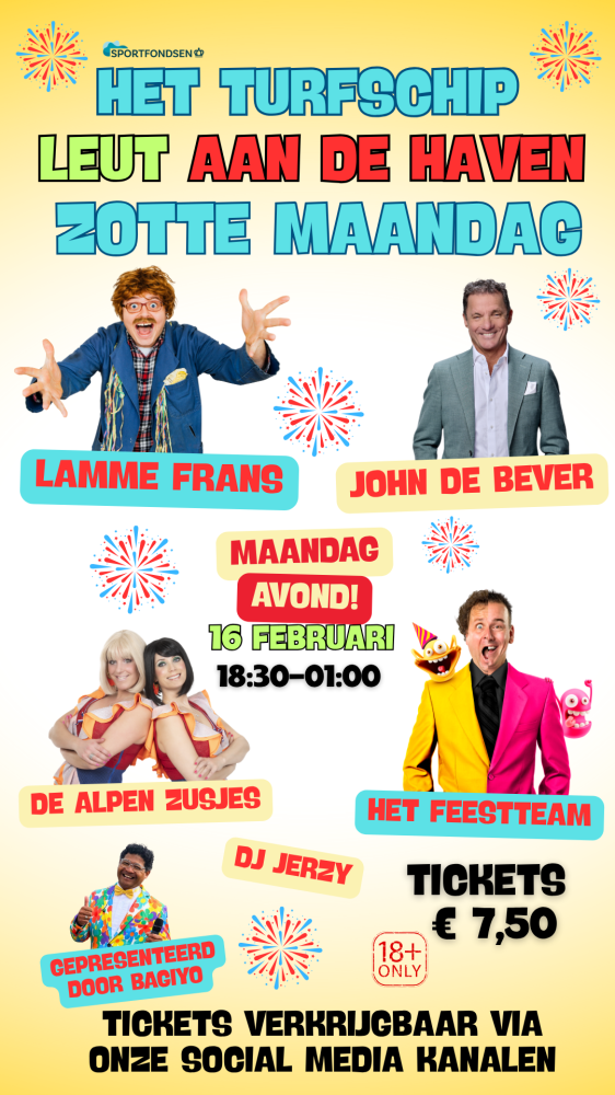 Leut aan de haven - Zotte Maandag. Wat een avond gaat dit worden. Met niemand minder dan, DE ALPENZUSJES, HET FEESTTEAM, JOHN DE BEVER en LAMME FRANS, wordt het Turfschip een groot feestpaleis. De hele avond is de presentatie in handen van niemand minder dan Bagiyo van der Leemputte en zal DJ JERZY de confetti uit het plafond laten knallen.