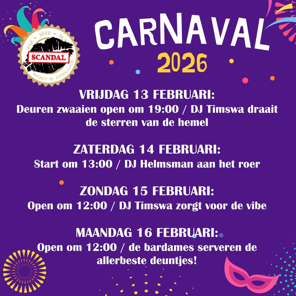 - Van vrijdag t/m maandag. Vier vier dagen carnaval in Scandal Bar.